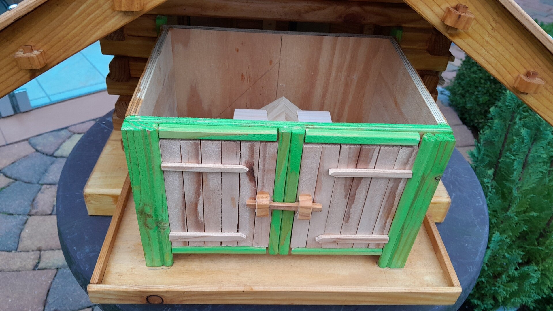 Das Futtersilo. Der Vogel kann an allen 4 Seiten an das Futter