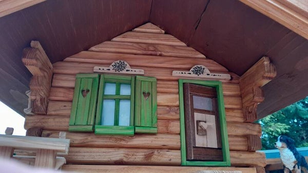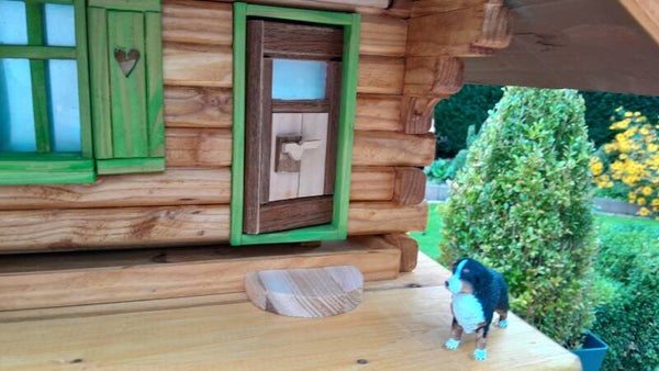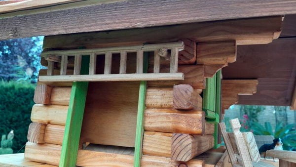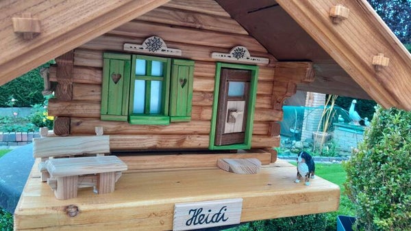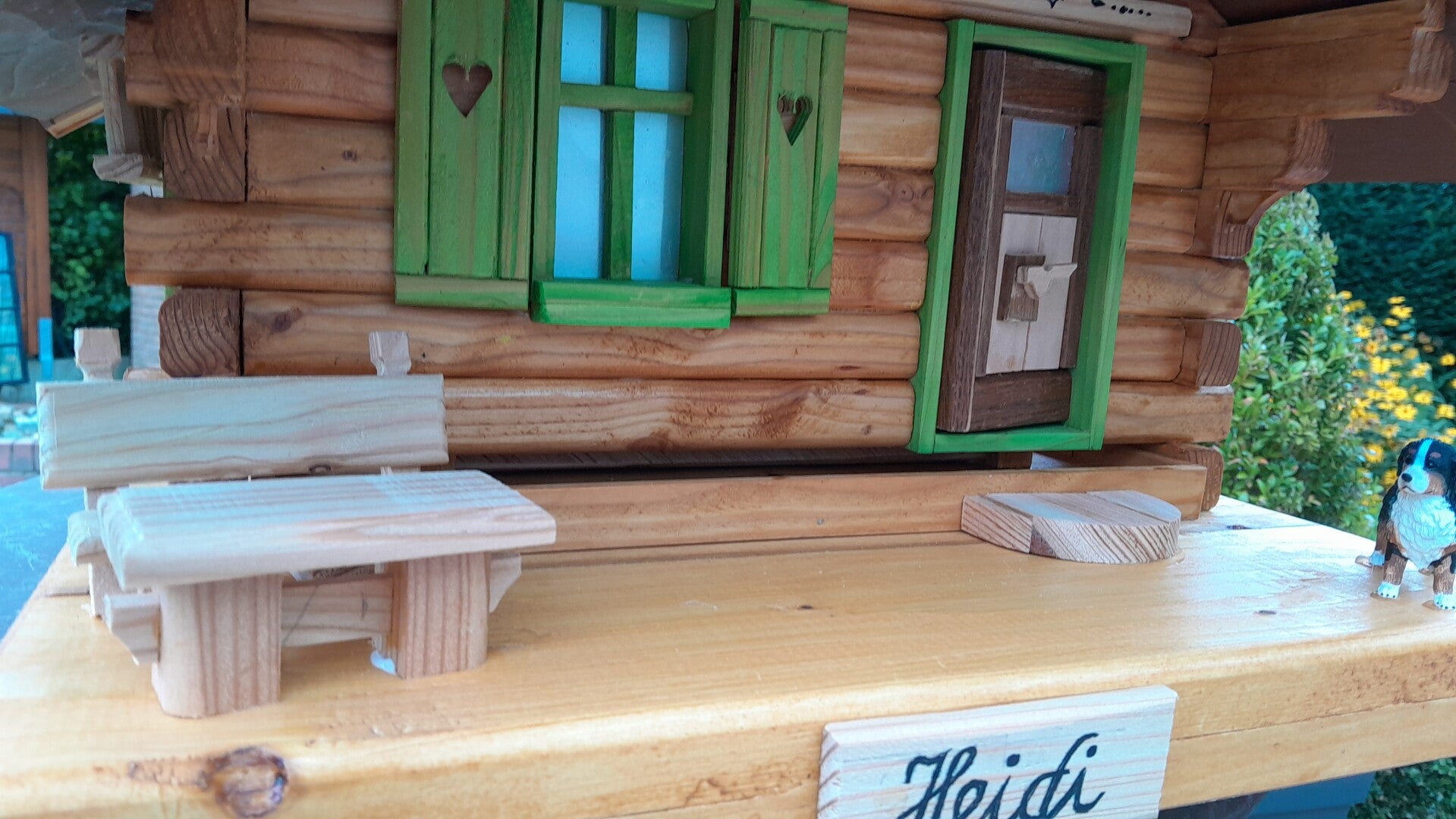 Das Haus «Heidi» ist vom Aufbau und von der Verarbeitung genau wie alle meine Meis-Alm Vogelhäuser. Die Blockhausverarbeitung, die alpine First und auch das Dach sind genau wie bei dem Haus Meis-Alm-groß. Das Haus ist nur weiter ausgebaut mit mehr alpenländischem Flair. Die Vorderfront mit einer schönen Haustür, Fenster und Windläden machen das Haus zu einem besonderen Vogelhaus. Eine Leiter, eine Schubkarre und eine Sitzecke geben dem Haus etwas Märchenhaftes. «Heidi». (Leiter und Schubkarre sind Sonderwünsche)